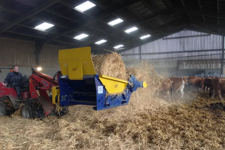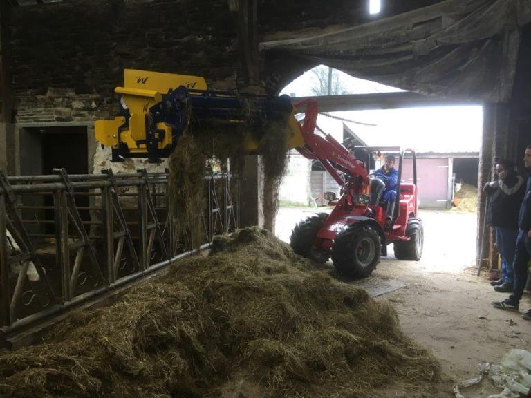 De stroverdeler verdeelt ronde balen tot 800 kg en is geschikt voor de verdeling van groenvoer, hooi, stro, gras enz.. Door de specifieke bouwwijze van dit aanbouwdeel, waarbij een bord met opneemtanden en een verdeelbak gecombineerd worden, kunnen opeenvolgende handelingen erg efficiënt uitgevoerd worden. Met het bord met twee tanden wordt eerst een ronde baal opgenomen en geladen, en vervolgens wordt ditzelfde bord gebruikt om de verdeler op te nemen. De mechanische koppeling tussen het opnamebord en de verdeler is 100% automatisch.